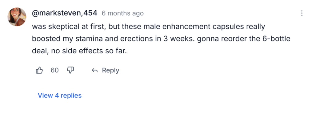 • Customer experiences highlight stronger erections, increased stamina, enhanced libido, and improved confidence.